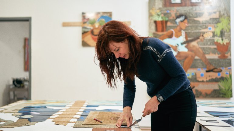 Marquetry hybrid artist Alison Elizabeth Taylor’s Brooklyn studio—full of wood veneer pieces, tools, and a prized coffee maker—is where a spark of an idea is refined into physical form.