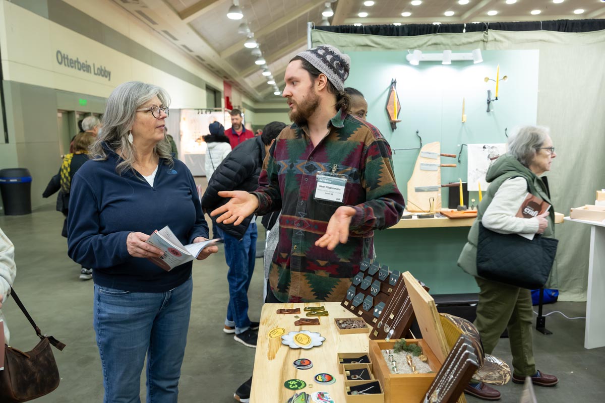 Booth sitting is an excellent way to meet artists, learn about their crafts, and interact with event guests. This service, offered free of charge by the American Craft Council, allows event exhibitors to have their booths attended by a volunteer or staff member while they attend to other matters. While the artist is away, booth sitters engage with guests, inform them that the artist will return shortly, and answer simple questions about the event or the work, if possible. Booths are typically staffed for about 15 minutes, but this may vary based on the artist’s needs.